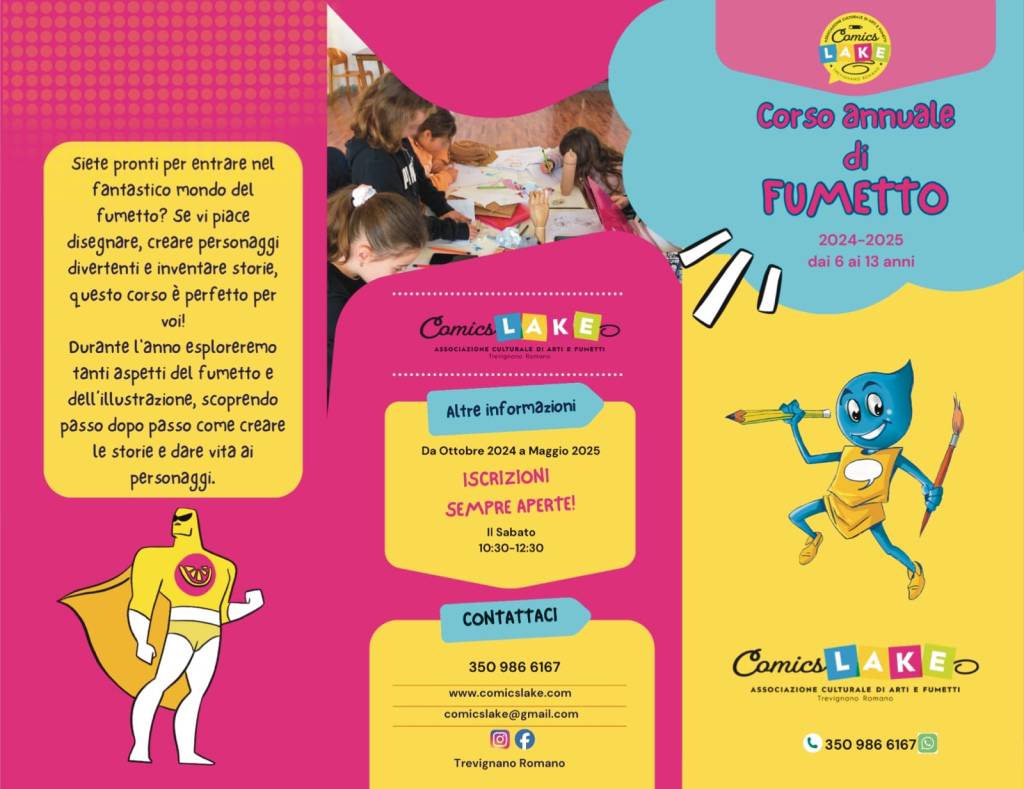 Comics Lake presenta a Trevignano Romano i corsi annuali di fumetto pensati e strutturati per i ragazzi dai 6 ai 13 anni, sia nei contenuti dell’insegnamento sia nel modo di proporre le tecniche fondamentali del disegno e della comunicazione visiva.